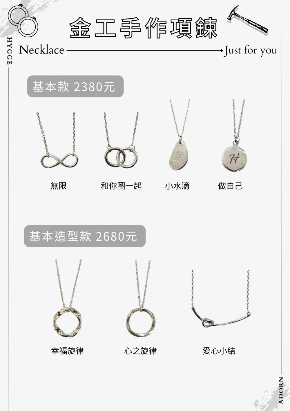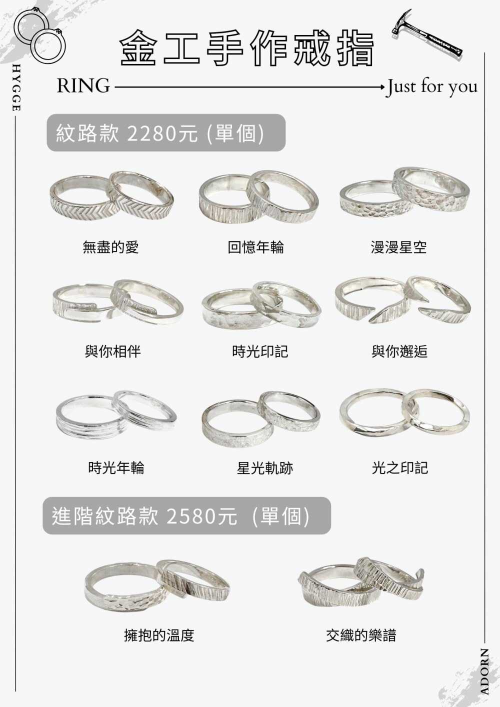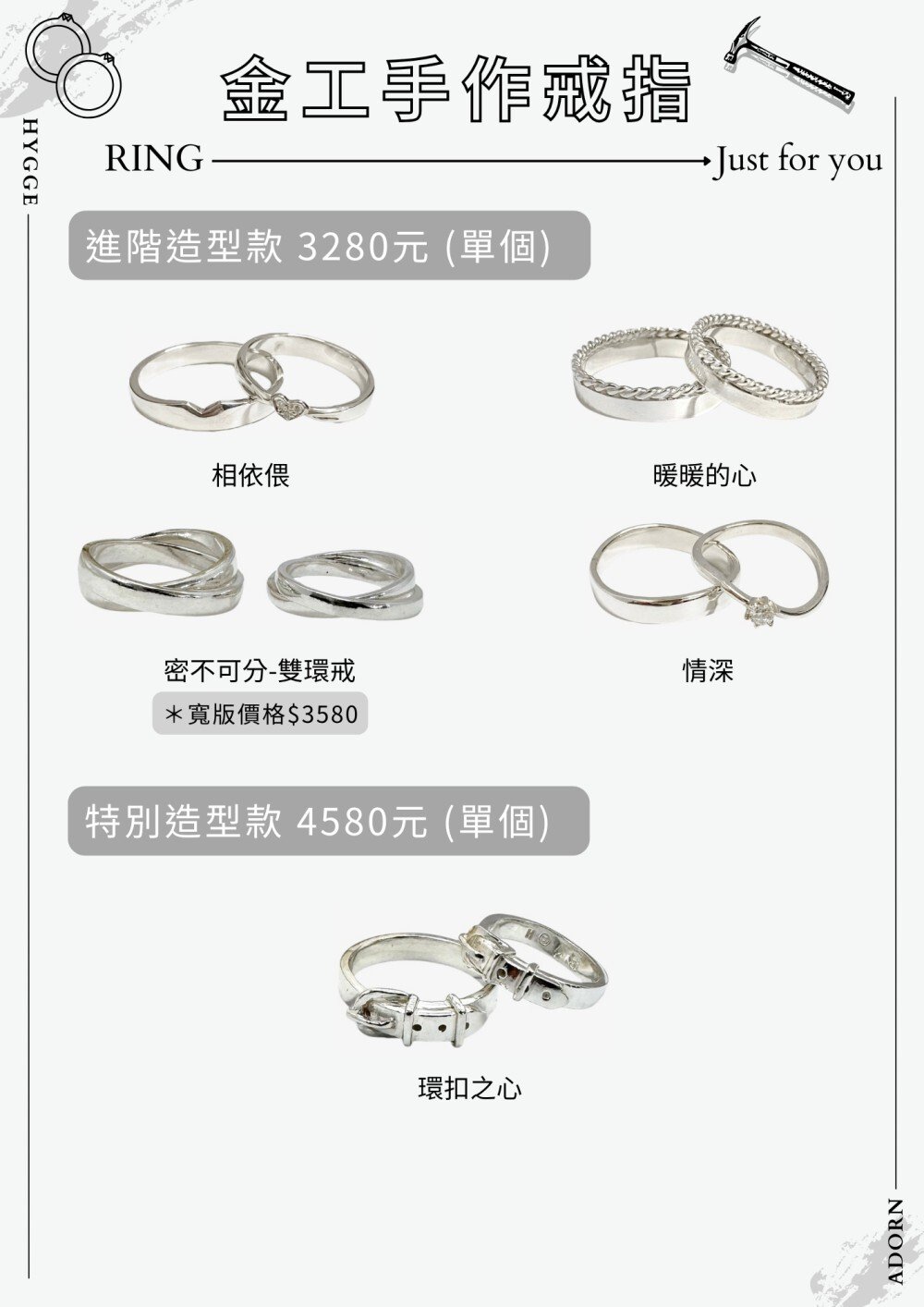 HYGGE ADORN 我們的手作為從原始的銀條開始做起,每一個步驟都為你親手操作,新手也不用擔心,師傅會適時地給予協助。小班制讓你的金工體驗為舒適輕鬆的,手作結束後還有提供小茶點可以慢慢享用。一起來趟溫馨浪漫的金工手作之旅吧!
