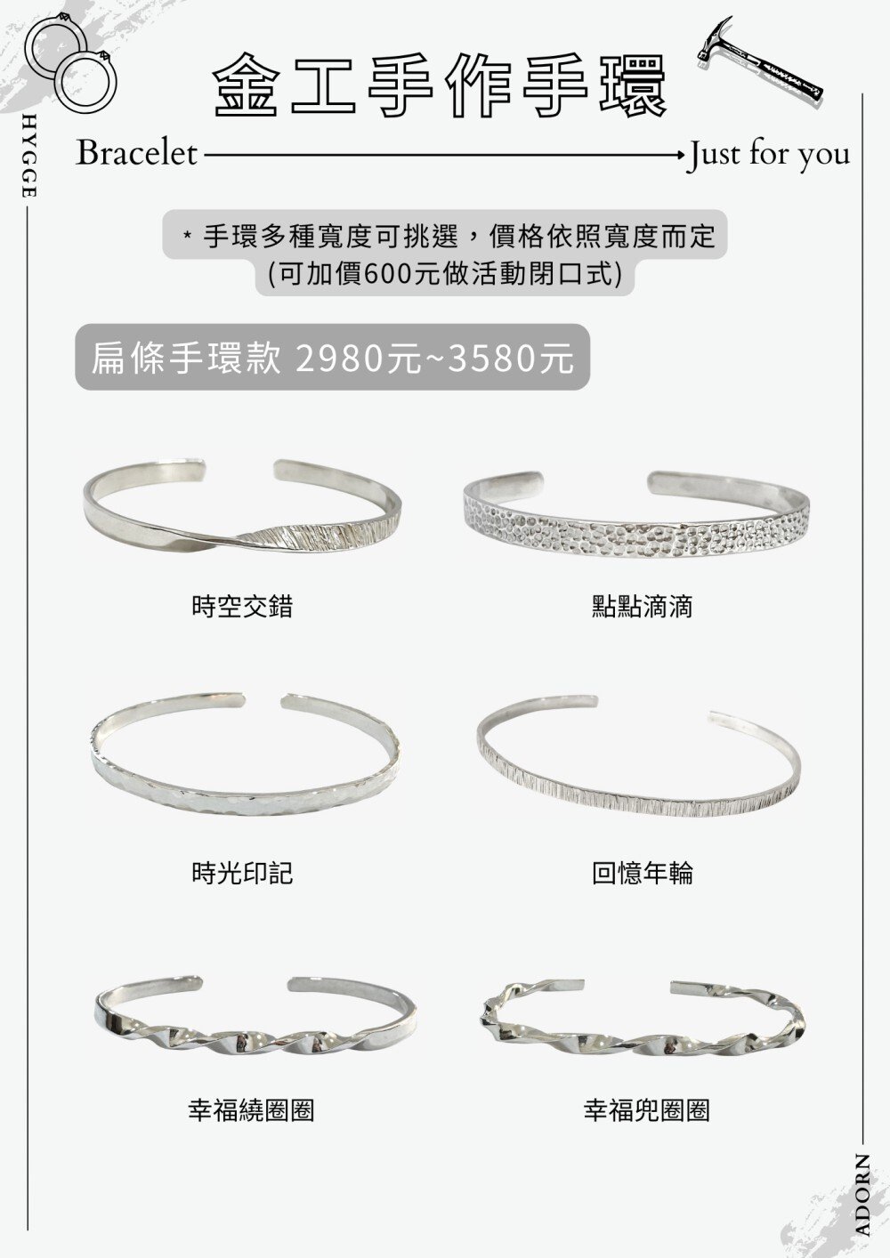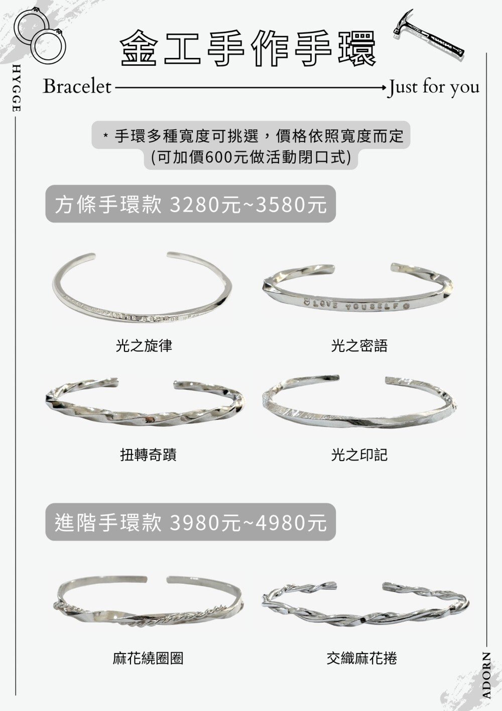・手環平面款式寬度為 3 mm、正方條為 2 mm,可至現場挑選試戴後決定是否加價改為 3 mm - 4.5 mm。
