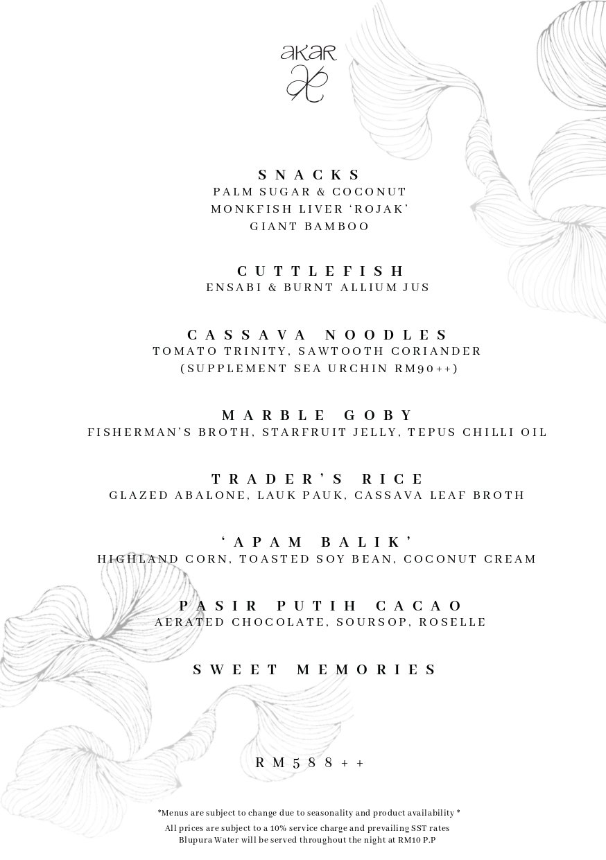 ・Embark on "Mekar," a journey through Malaysia's lush and vibrant ecosystems. Celebrate nature's bounty with local and indigenous ingredients, woven into a harmonious marriage of cultures. Indulge in a symphony of flavours where tradition and innovation blossom together.