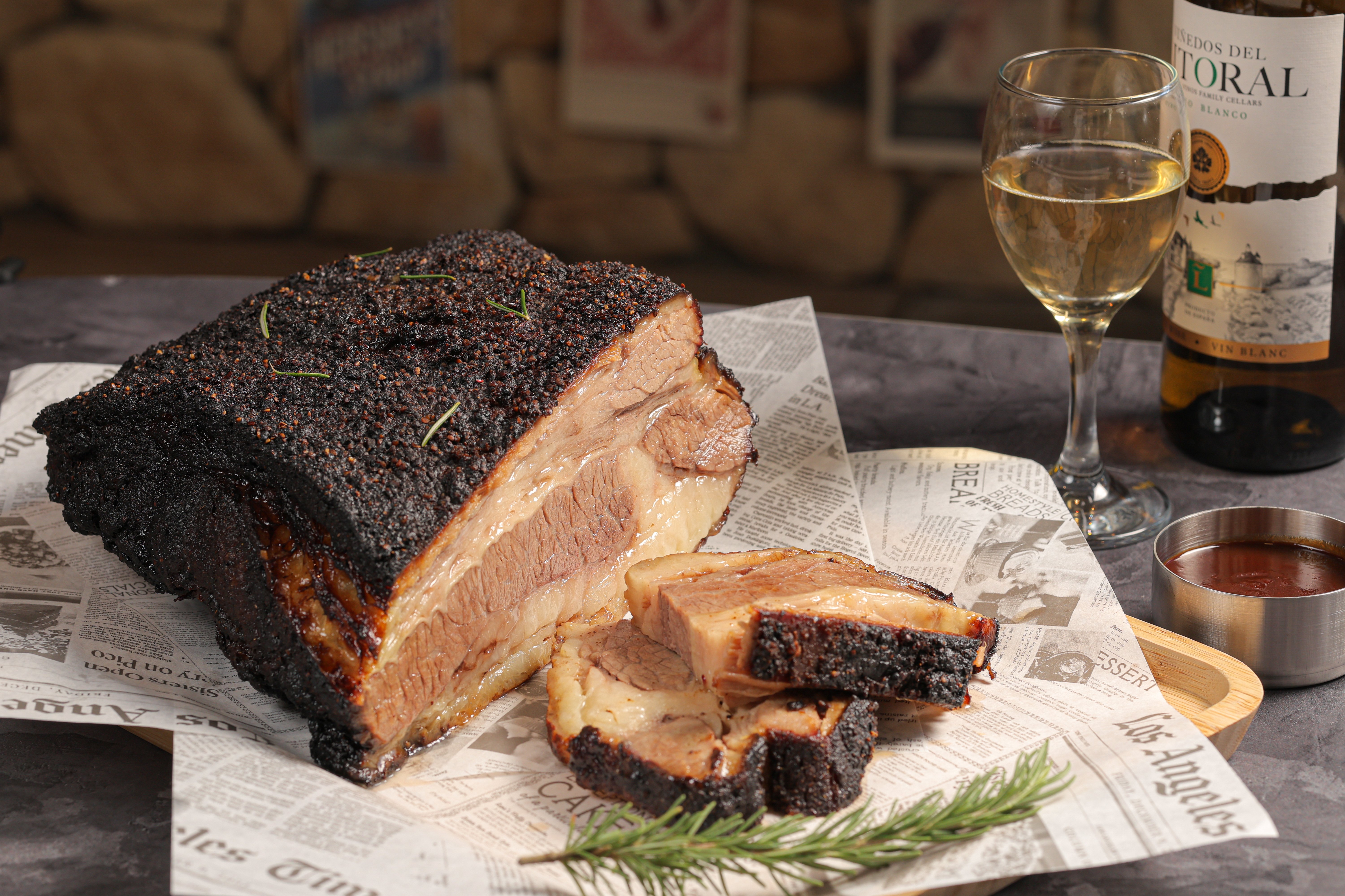 裹覆香料低溫煙燻8小時,充分吸收濃郁煙燻香氣,肉質多汁柔嫩,風味醇厚迷人,可看見肉纖維因慢火燻烤而層層剝落的迷人質地。