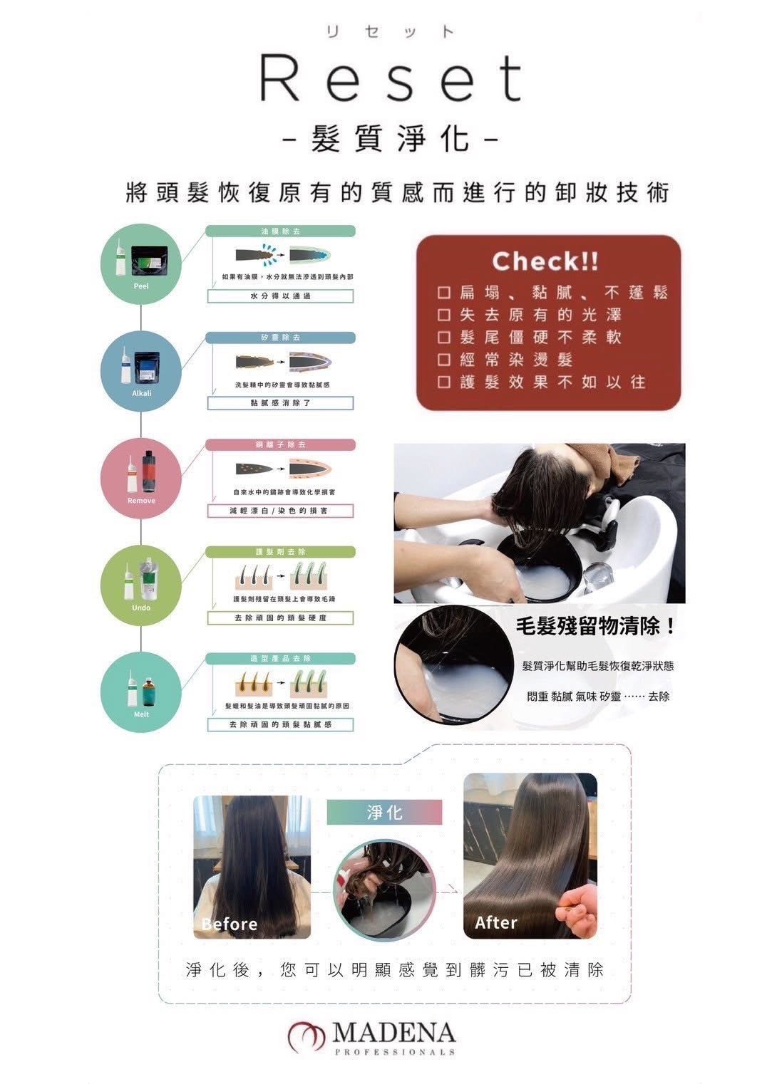 ・特色:讓頭髮回歸本該有的模樣,當頭髮出現扁塌、黏膩、失去光澤,或是護髮效果不如以往時,通常是因為頭髮表面堆積了過多的殘留物。本方案透過「髮絲卸妝」的概念,分階段精準去除汙垢。